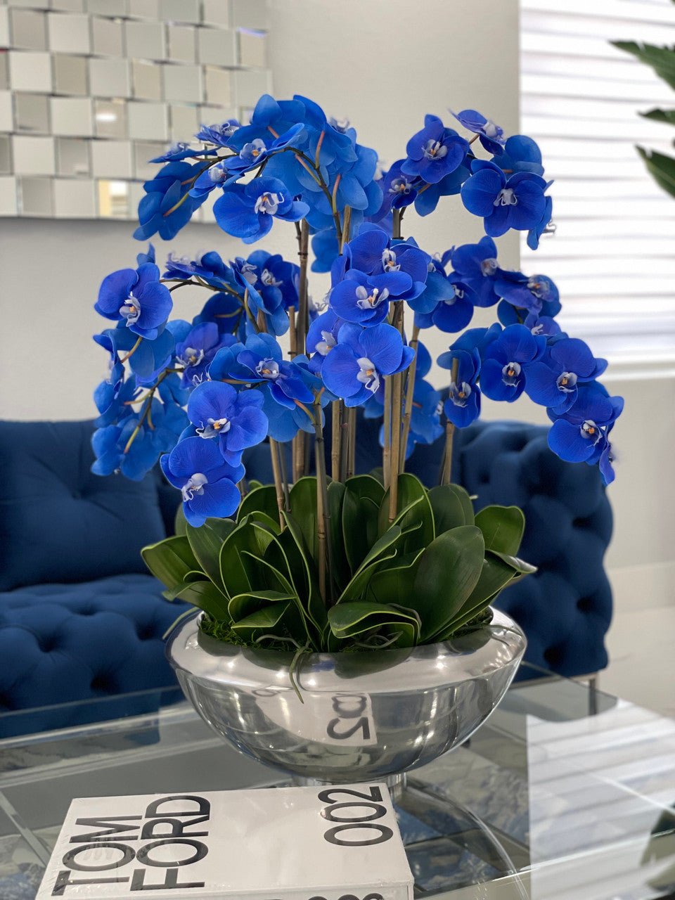 Graceful and exotic. the phalaenopsisorchid has symbolized integrity. nobility. and luxury for centuries. Our enduring. blue phalaenopsis arrangement captures the artistry and spirit of natural orchids. It’s prized for its profusion of perfect blooms. Vertical bamboo stakes. broad green leaves. and a genuine moss base add to the realism of this arrangement.Often called the moth orchid. the phalaenopsis is a favorite among our designers for its dense leaves. elegantly arching sprays and lovely blooms. Our remarkably lifelike arrangement is staked into a moss-covered silver avenue bowl for a timeless. authentic look that will endure for years to come. This arrangement is just the right size and is versatile enough to use as a coffee table centerpiece. a dining room or console table. It has a luscious tropical feel that will add vibrancy and elegance to any room.